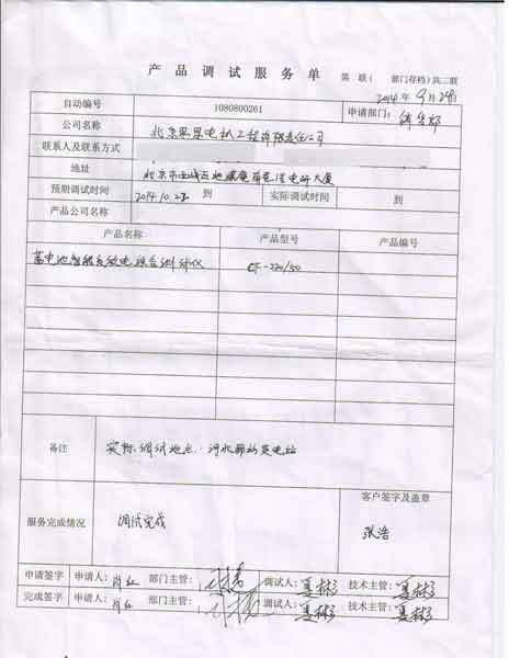 2014-10-31 北京思恩機電工程有限責任公司進行調試服務,調試產品:CYCF-220/50蓄電池智能充放電綜合測試儀